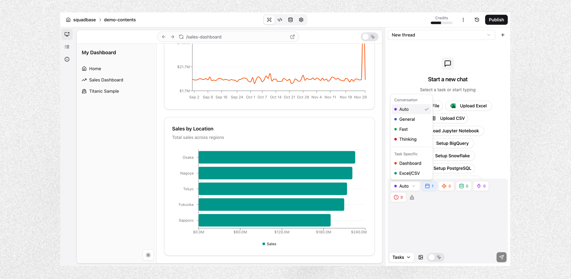 With the new UI, you can upload a file from the chat and then switch to the Data tab, where your uploaded data and your conversation with Squadbase AI are displayed side by side. This layout enables a more interactive and seamless data preparation experience.